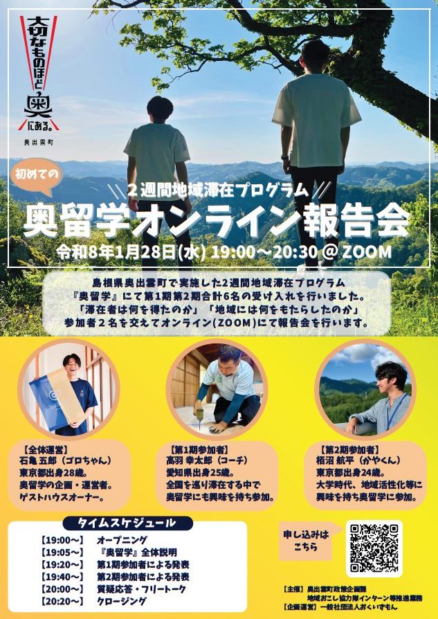 奥出雲町にて、令和7年度初めて実施した2週間地域滞在プログラム『奥留学』のオンライン報告会が開催されます!